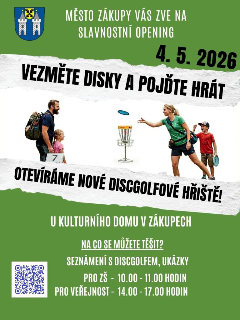 Vezměte disky a pojďte hrát! Otevíráme nové discgolfové hřiště za Kulturním domem v Zákupech. Dne 4. 5. 2026.
